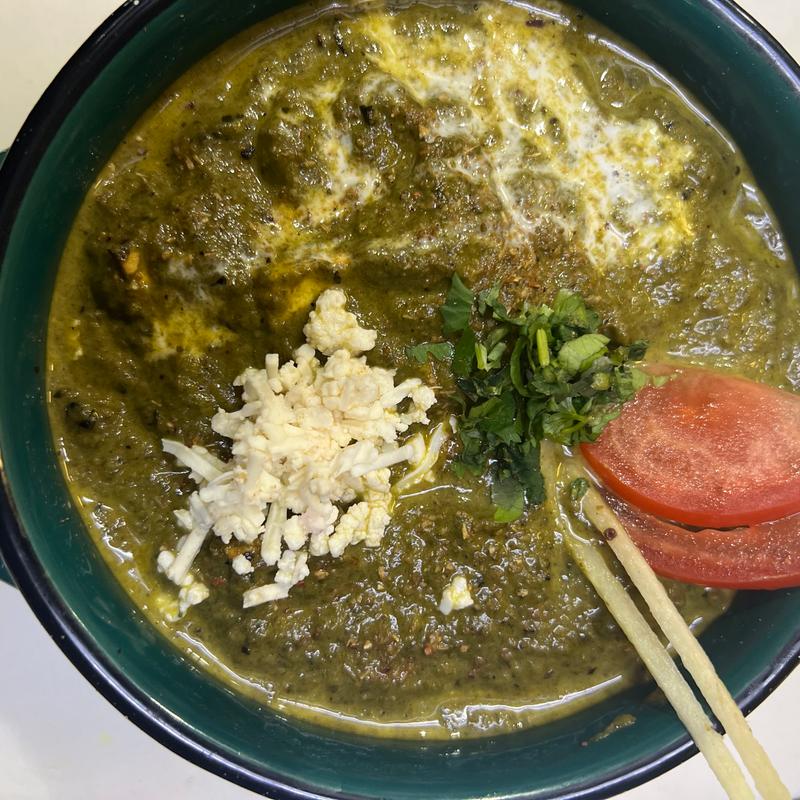 Spicy | Creamy Spinach cooked with onions, ginger, garlic, various Indian spices, and fresh paneer (Indian Cheese). *Nut Free*
