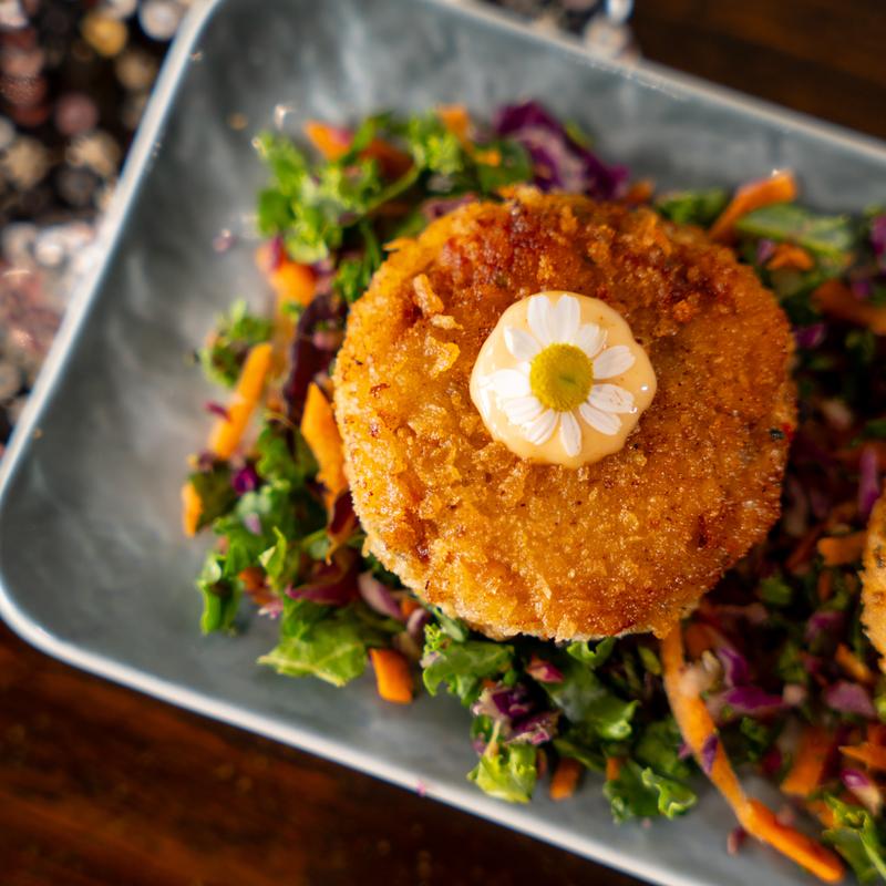 Chargrilled beets & blanched yellow squash croquette, topped with our homemade aioli & goat cheese. Served on a bed of organic kale, red cabbage & carrots.