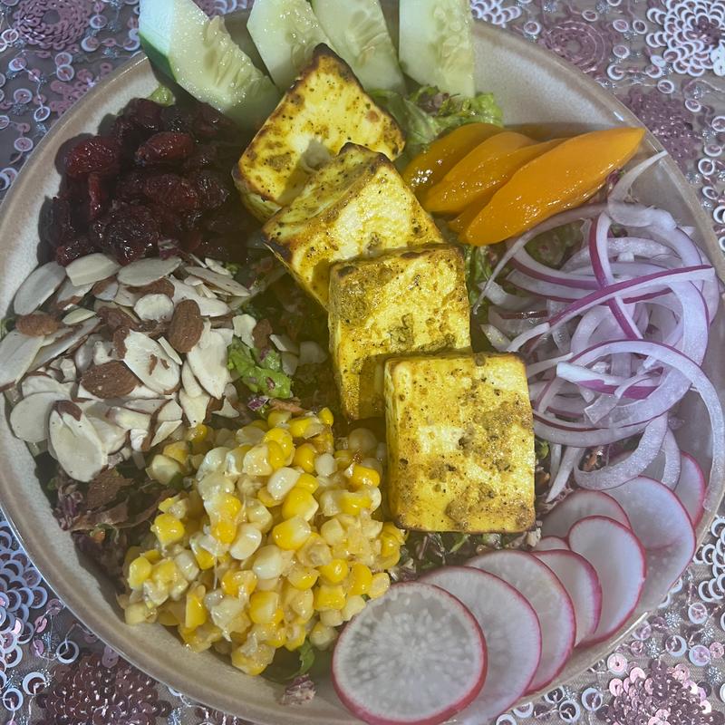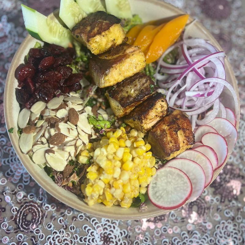 Our signature blend of organic kale, red cabbage & carrots tossed with lemon aioli on a bed of romaine lettuce. Topped with thinly shaved red radish, blanched butter corn, sliced almonds, dried cranberries, red onions, cucumbers, & fresh mango.