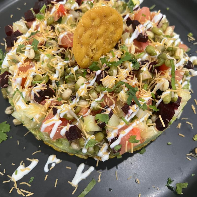 Freshly sprouted mung beans layered with puffed rice, tamarind, mint sauce, and our green chilly guac. Topped with onions, tomatoes, beets, cucumber & yogurt.